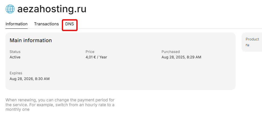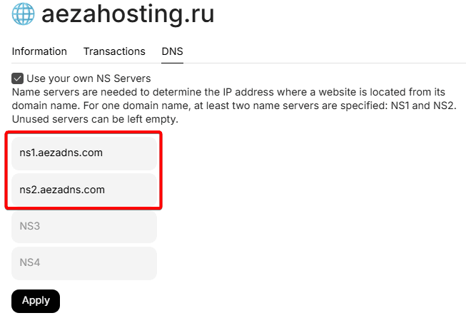 By default, when purchasing domains in Aéza we automatically specify the following two NS records: