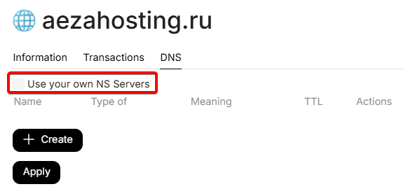After changing NS records, you will be able to use this domain for your own website located either in Aéza hosting and you will be able to fully use our Web Protection for your websites and services, or outside Aéza hosting addresses.
