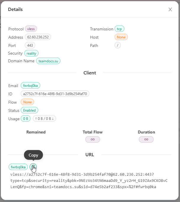 Now your server is ready to create a connection key. We will tell you about its creation in point 2 ("Accessing the 3x-ui panel and creating a user key")