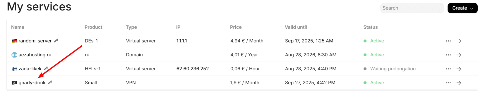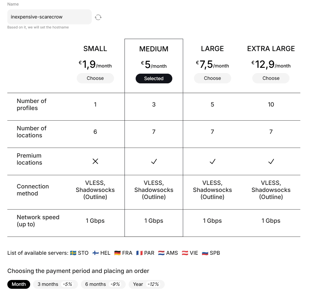 Also at the time of purchase, you can set the desired service name, choose the payment frequency and also familiarize yourself with available protocols and locations.