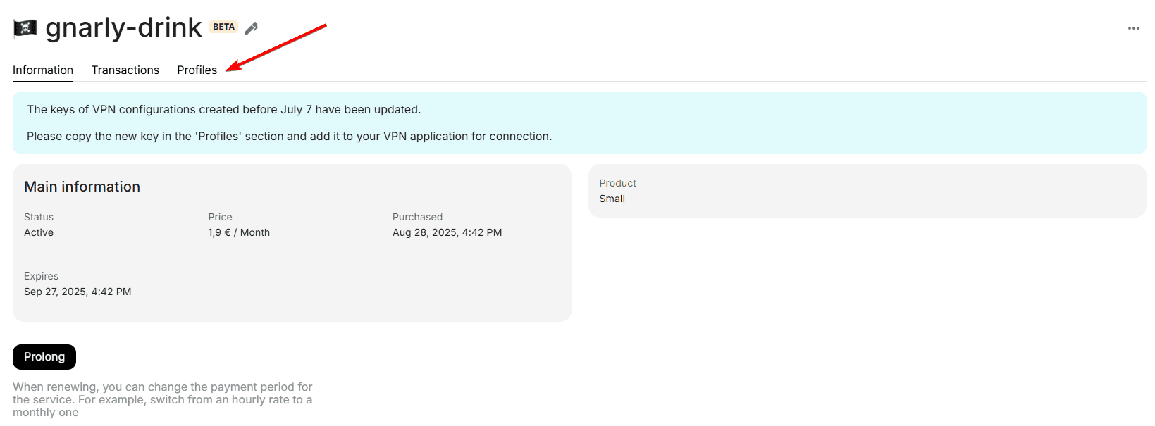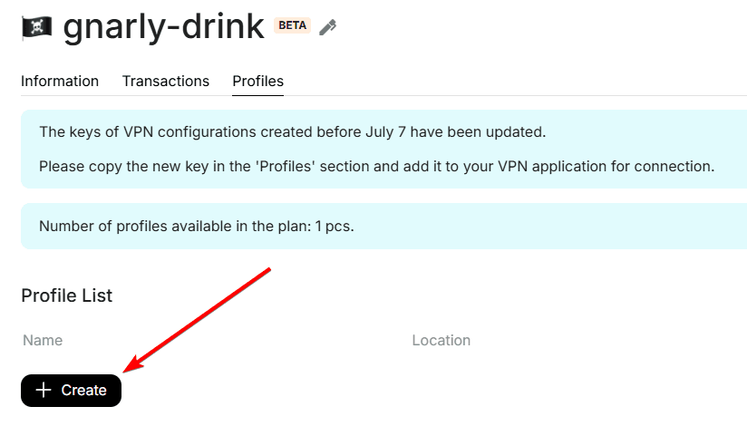 In the "Profiles" section, you will find detailed information about your service, as well as the number of available profiles. For each profile, you can set its name.