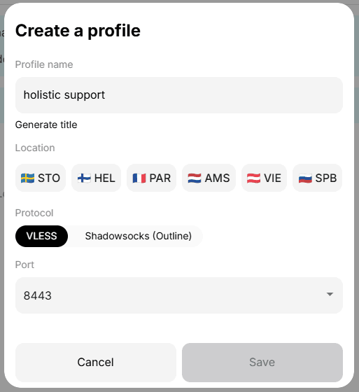 After selecting a profile, you will see a popup window where you can configure your profile on the selected location. Choose one of the two available VPN protocols: VLESS or Outline. Next, we will provide more detailed information about each of them.