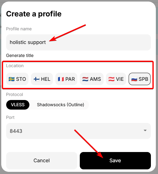 For example, let's choose the St. Petersburg location, VLESS protocol, port 443, then click the save button.