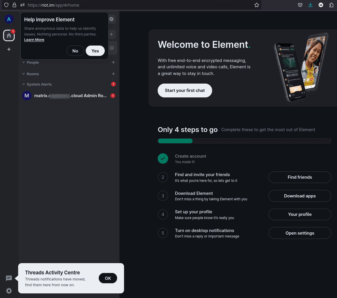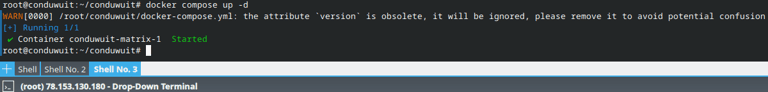 After completing server configuration, issuing SSL certificate and deploying the proxy server, we can start our docker container with Conduwuit.