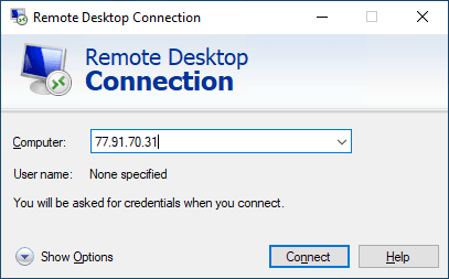 Then a Windows mini-application opens for connecting to servers via RDP protocol. In the "Computer" line, specify the IP address of the server to which we need to connect.