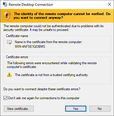 We confirm the connection to the server, set the checkbox so that the request is not displayed further and click "Yes".