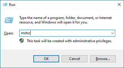A window appears at the top that offers to enter a command for further execution, we write mstsc.