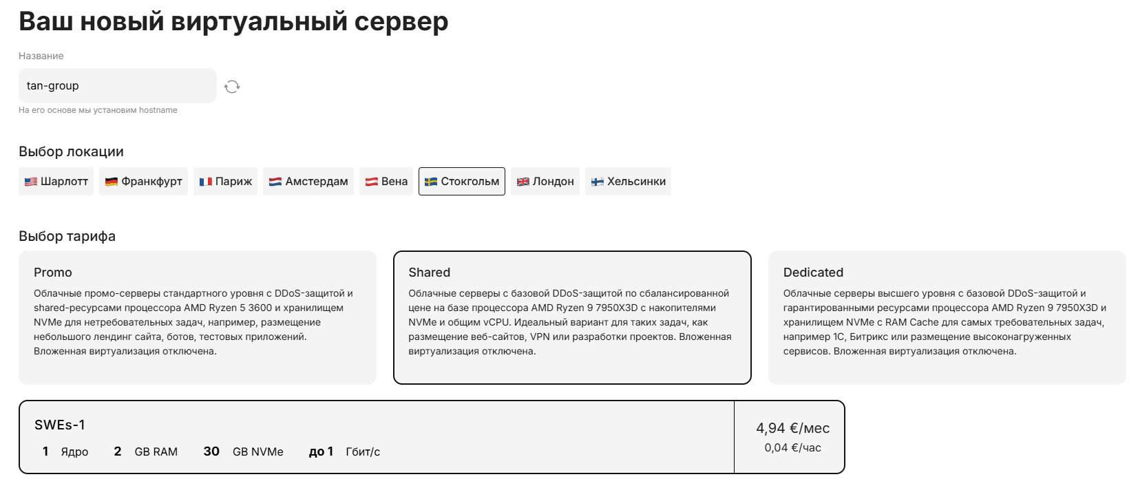 To do this, we will need to buy the necessary server in the desired location. In our case, this will be the base tariff SWEs-1 in Sweden.\