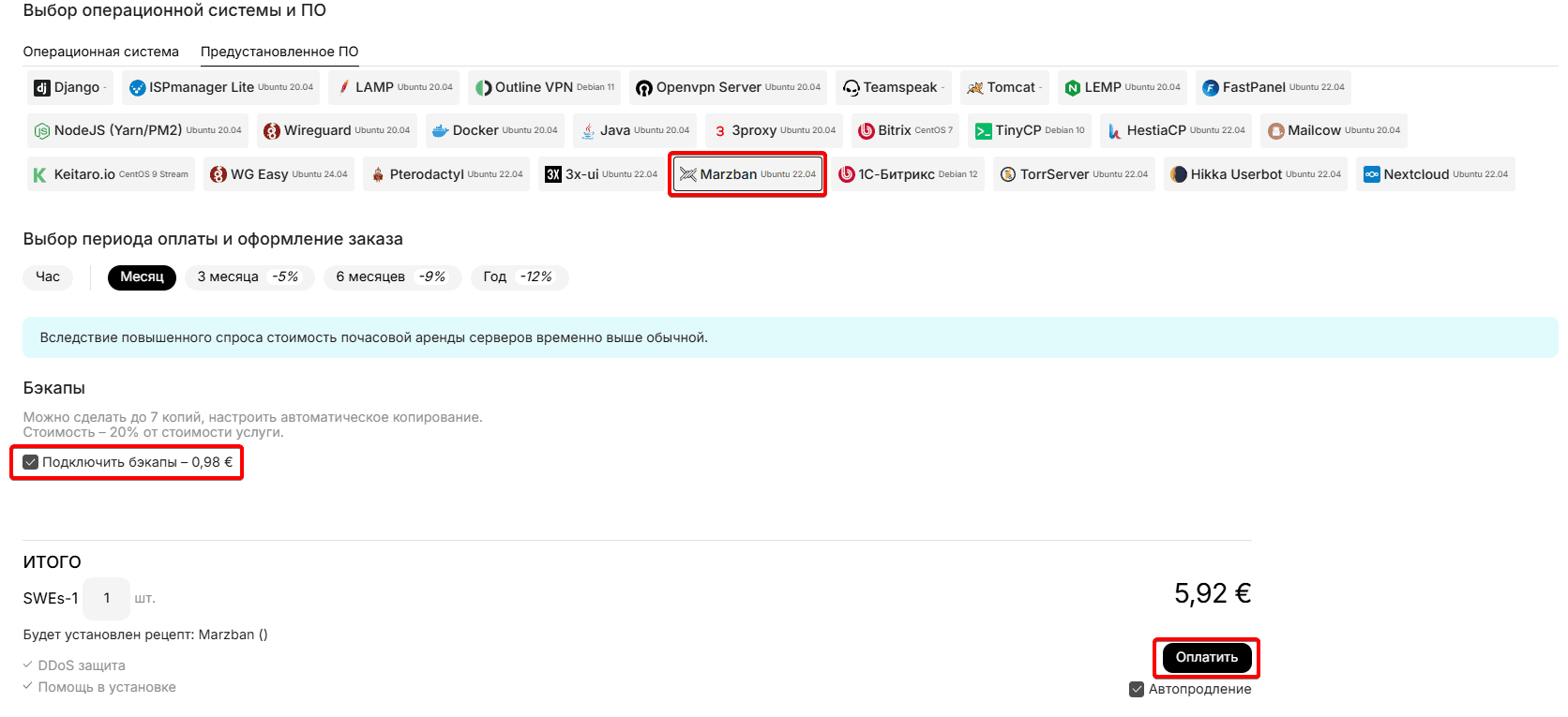 Select the desired server rental period, if necessary, disable the Backups service and click the "Pay" button: