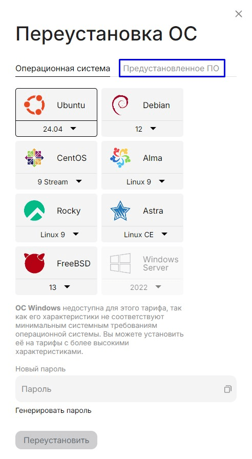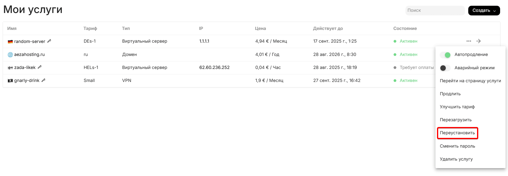 Let's go to the services section and click the colon icon to the right of the already purchased server, select reinstall