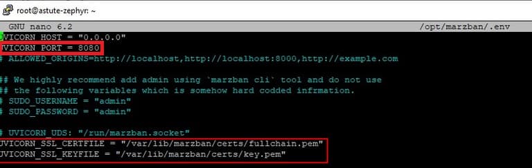 - Issue an SSL certificate for the domain name and specify the certificate in the configuration of the Marzban panel