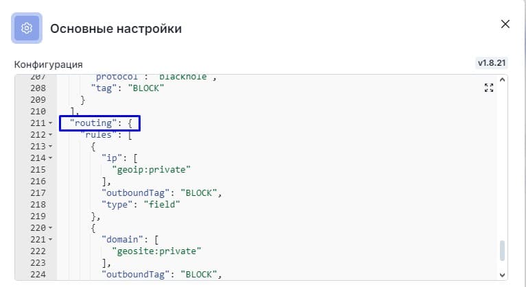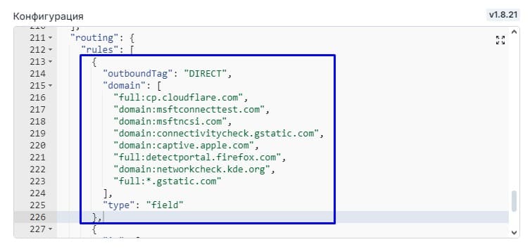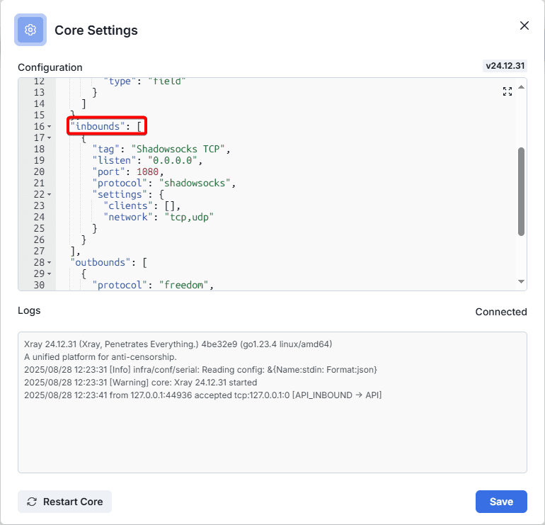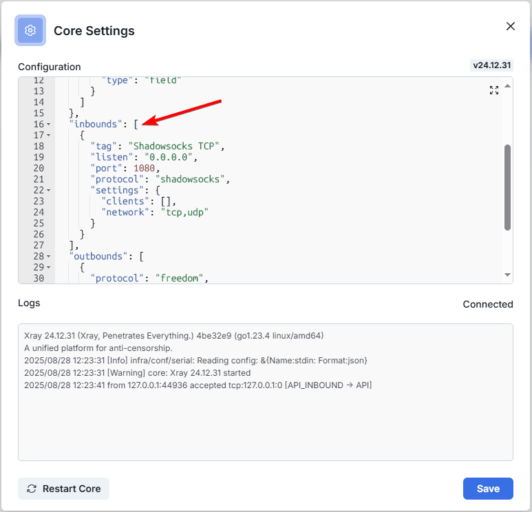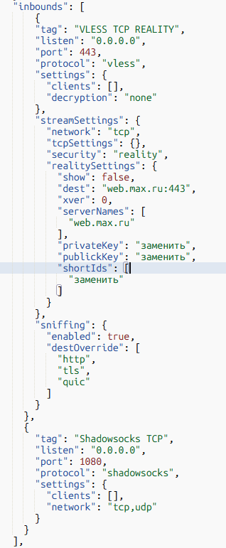 We observe that in the "Inbounds" block there are only TCP Shadowsocks, add VLESS TCP Reality to the beginning of the block after the square bracket