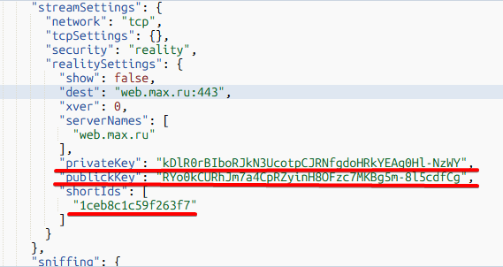 We need to copy the Private key and shortIds parameters and then replace them in the panel
