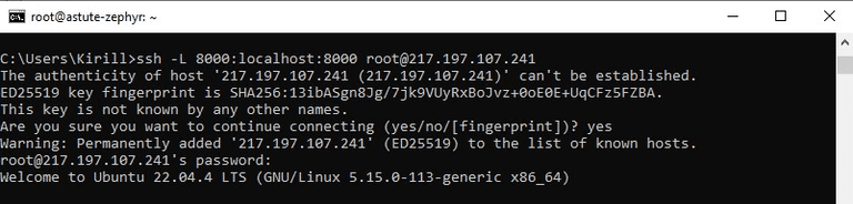 ssh -L 8000:localhost:8000 root@server IPFor Windows systems, the command must be entered at the command prompt (cmd).