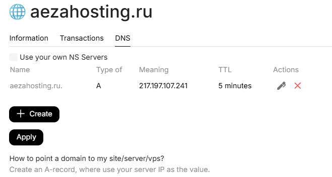 If the domain name already exists or was purchased elsewhere, ** you need to add an A record directed to the server with the Marzban panel**