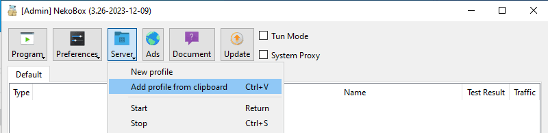 - Paste it into Nekoray using Ctrl + V or through the menu: