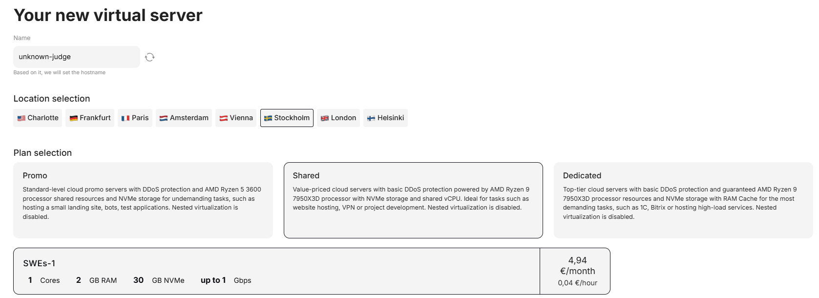 For this, we need to buy the necessary server in the desired location. In our case, it will be the basic plan PARs-1 in Paris: