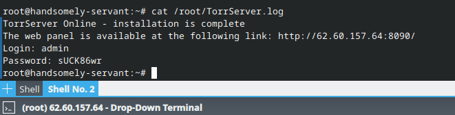 In the root directory of the server we need to find the "TorrServer.log" file with data for connecting to the TorrServer panel and view them, the path to the file: /root/TorrServer.log
