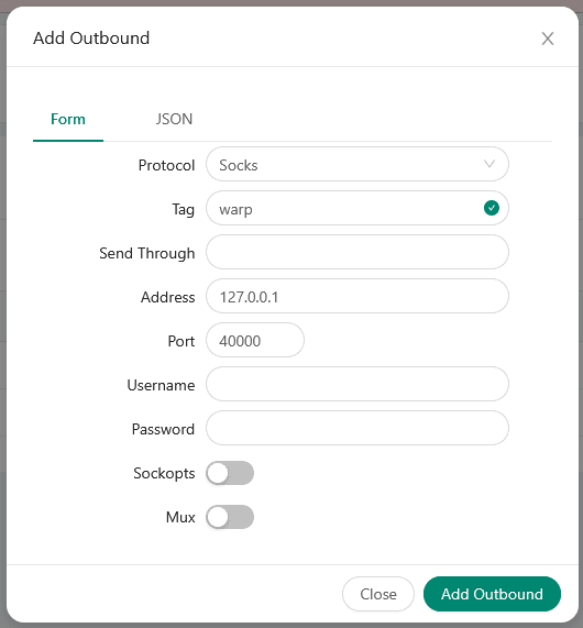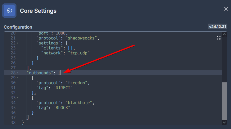 Scroll to the outbounds section, add the necessary settings to the beginning of the block after the square bracket