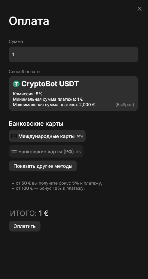 Готово! Мы пополнили свой баланс через CryptoBot USDT.