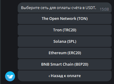 Для проведения оплаты необходимо наличие валюты (USDT) на балансе CryptoBot, либо наличие указанной валюты на внешнем кошельке. Если это так, то жмём Оплатить, после чего бот спросит в какой сети у нас есть USDT: