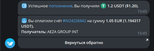 Приобретаем валюту указанными в боте способами, либо же переводим криптовалюту на указанный адрес с другого своего кошелька, обязательно не забыв про сеть, которую мы выбрали. Спустя несколько минут получаем уведомление об успешном пополнении баланса: