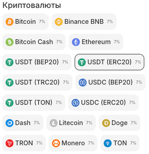 - Вы также можете пополнить баланс личного кабинета любой популярной криптовалютой, выполнив её приобретение удобным способом и проведя пополнение баланса по очень близкому к курсу ЦБ РФ курсу, с, как правило, небольшой комиссией блокчейна выбранной вами криптовалюты. Мы рекомендуем проводить пополнения в USDT, TRON, TON, Litecoin, как криптовалютах с наименьшей комиссией за перевод между кошельками.