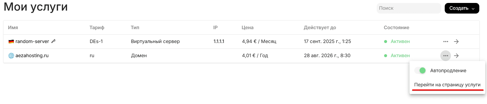 Нажимаем на три точки в правой части услуги и перейдём на её страницу: