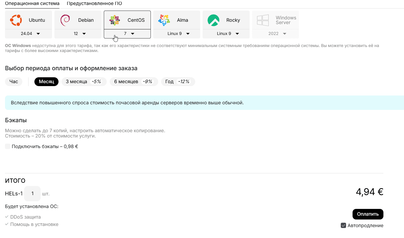 При заказе услуги необходимо также выбрать ОС CentOS 7, в которой будет происходить работа по непосредственно дальнейшему развертыванию образа CHR.