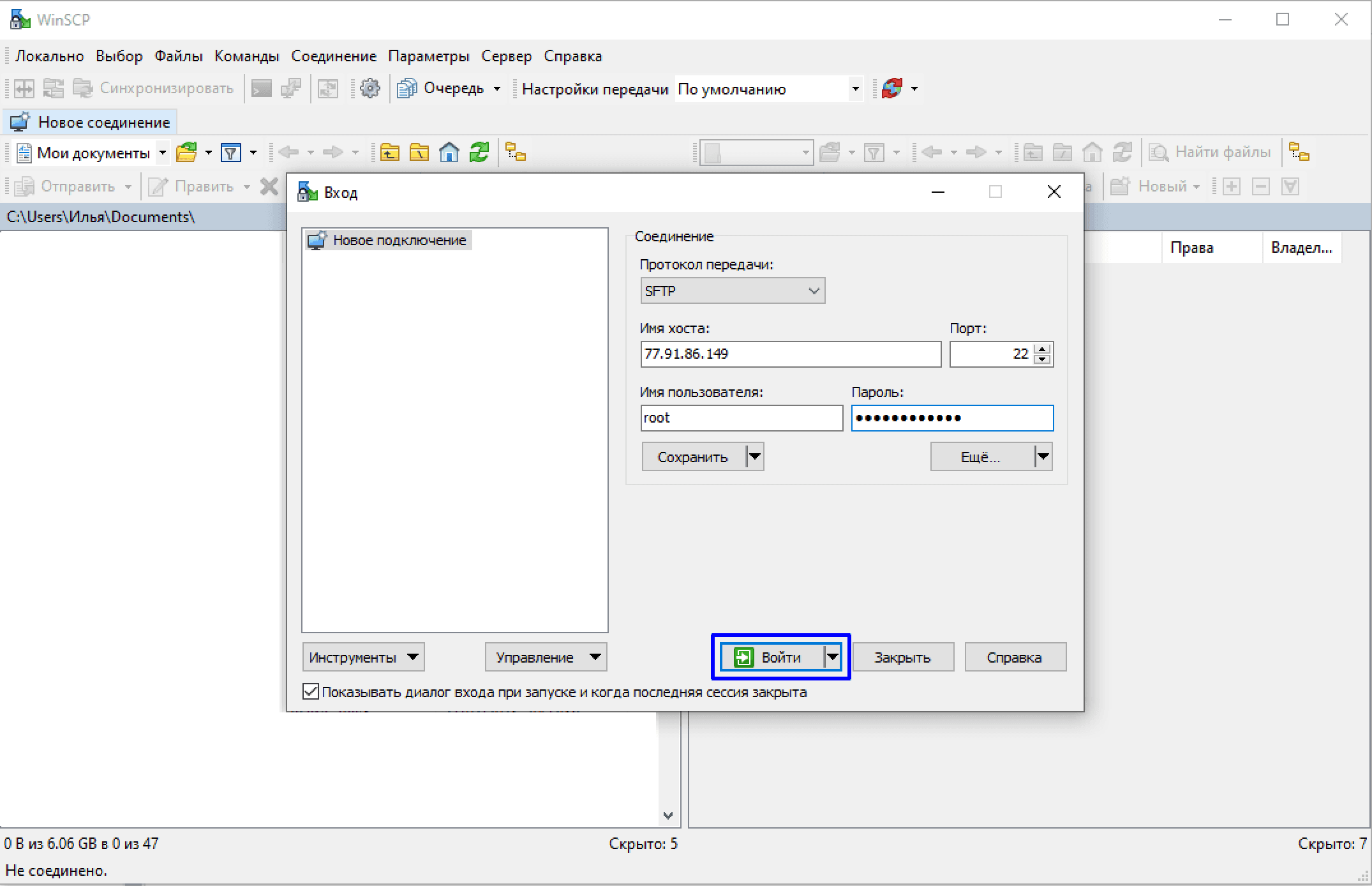 Подключаемся к серверу посредством WinSCP и логина, пароля из личного кабинета, либо письма с вашей почты (в случае переустановки ОС).