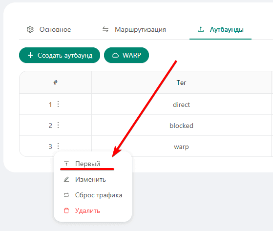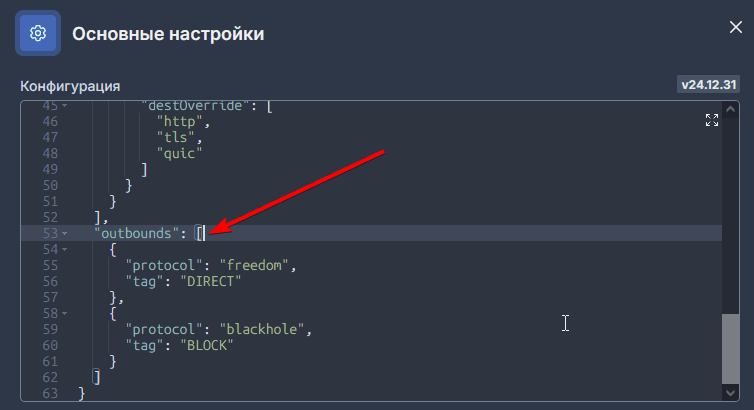 Прокрутите до раздела outbounds, добавим нужные настройки в начало блока после квадратной скобки