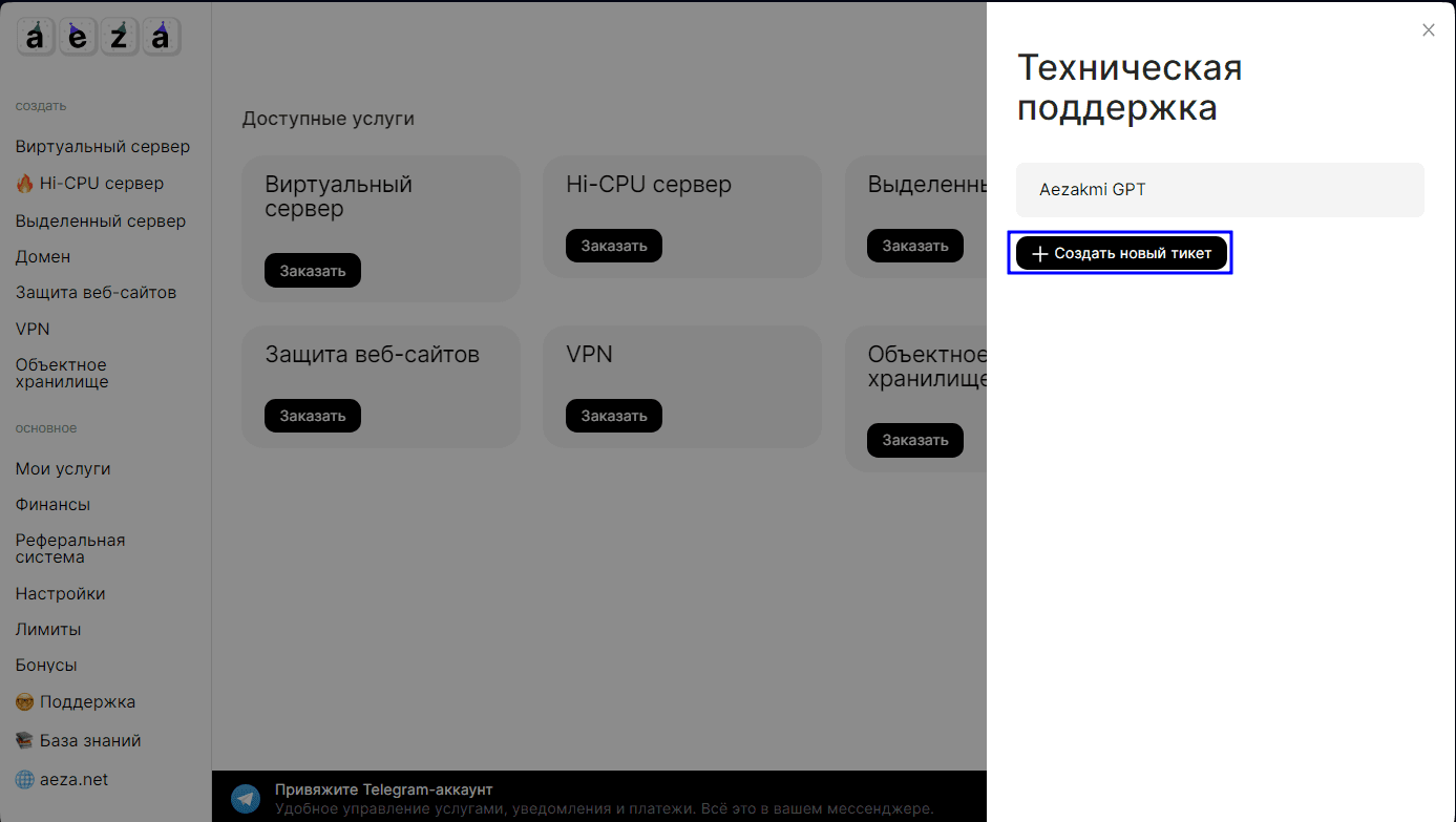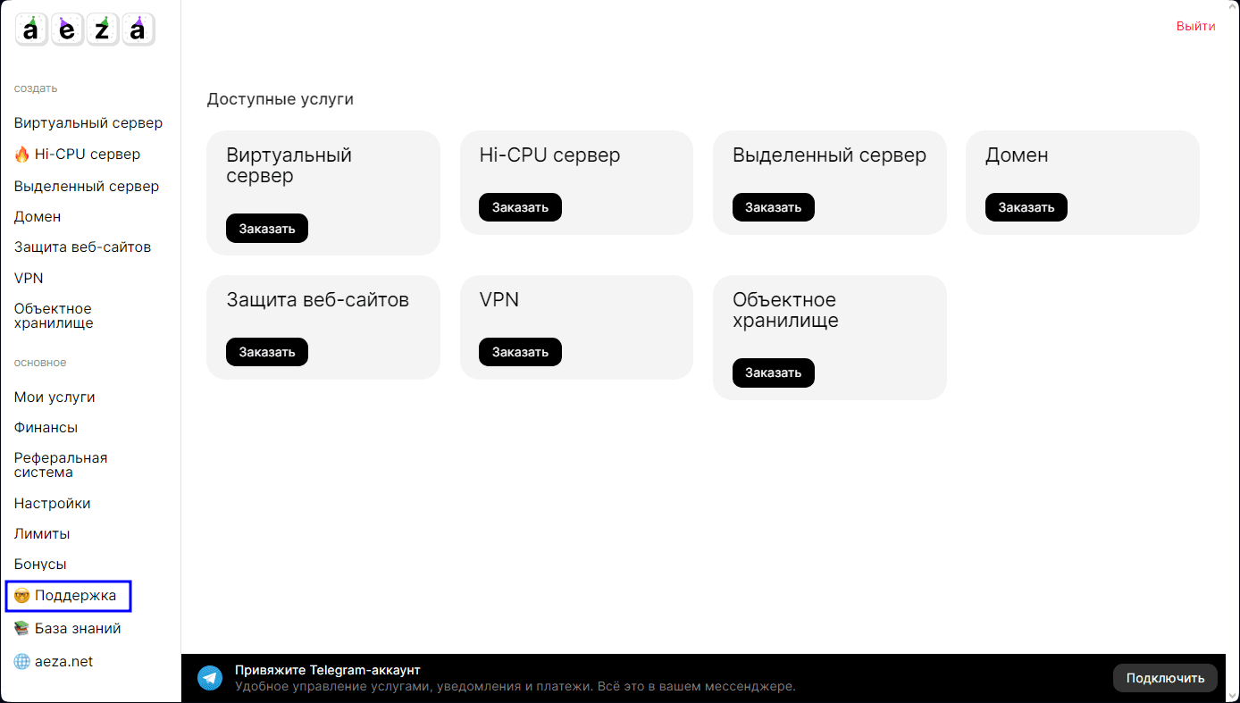 Зайдём в личный кабинет Aéza и нажмём кнопку «Поддержка» в левом нижнем углу.